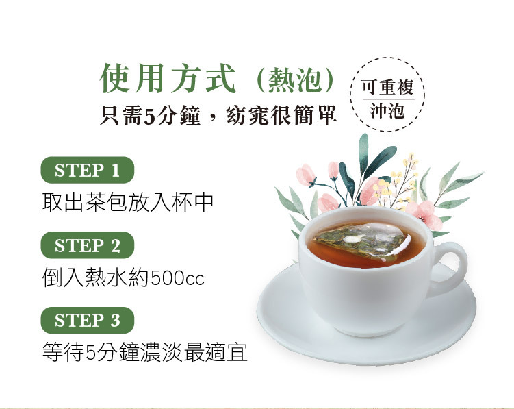 沖泡方式|熱水500cc浸泡5分鐘後飲用,可重複沖泡。
