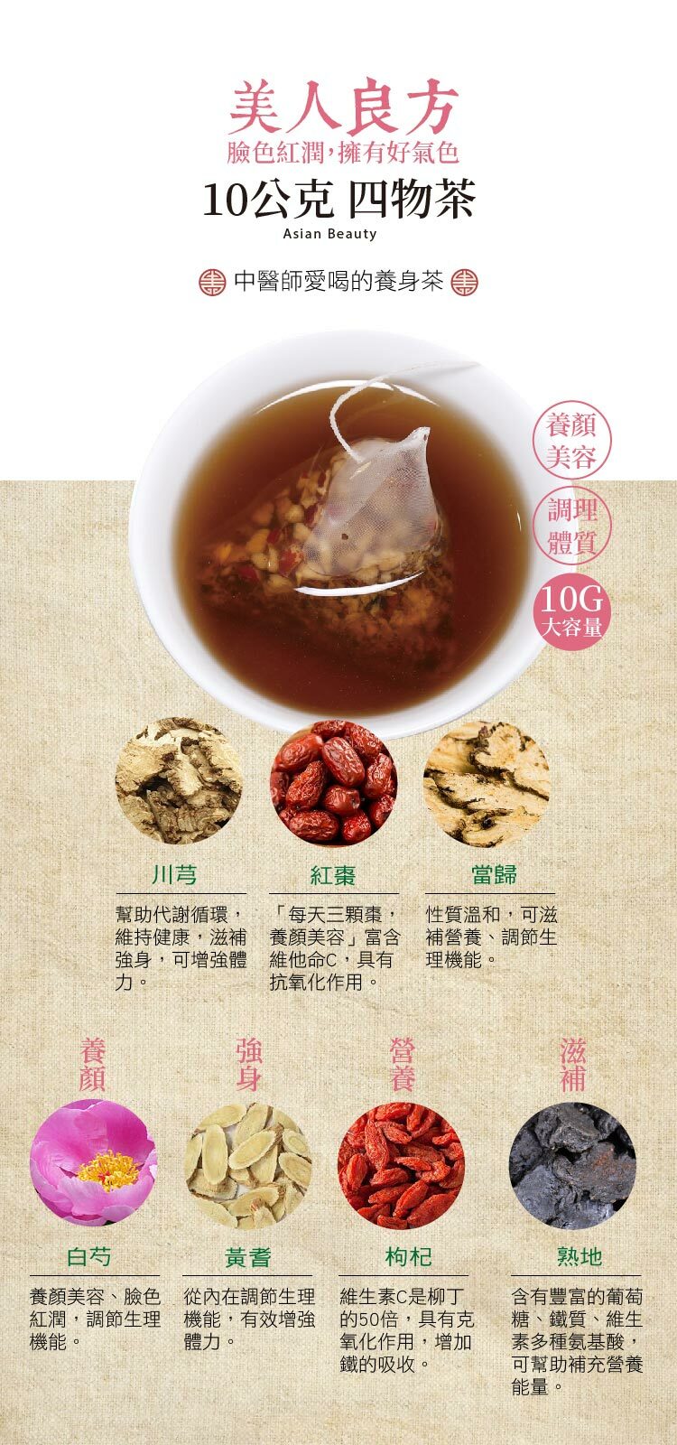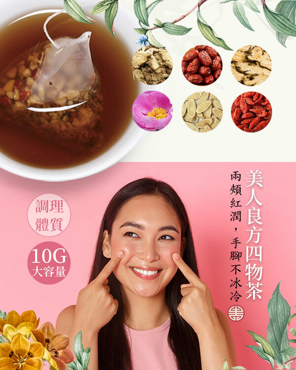 美人良方【10公克四物茶】,使用白芍等天然原料研製的草本養生茶,輕鬆沖泡的四物湯與四物飲,每天擁有好氣色! 四物湯不需熬煮只需熱水放入茶包,調整體質無負擔!